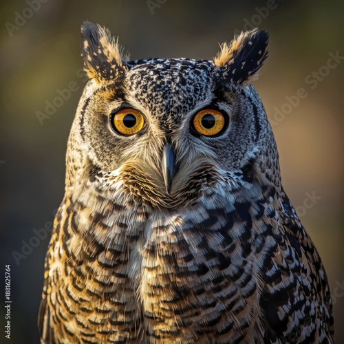 Majestic Spotted Eagle Owl Staring Intently with Yellow Iridescent Eyes, Soft Left Light, Symbolizing Freedom in Kgalagadi Transfrontier Park's Desert