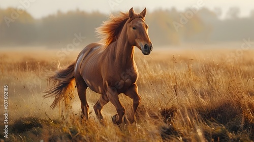 Majestic Stallion Galloping Through Windswept Field with Flowing Mane