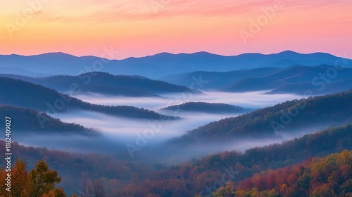 majestic sunrise over misty mountain range with ethereal fog rolling through valleys, capturing nature's serenity in soft pastel pink and gold hues