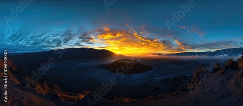 Majestic Sunrise Over Mount Bromo Landscape with Dramatic Sky and Volcanic Crater in Central Java Indonesia