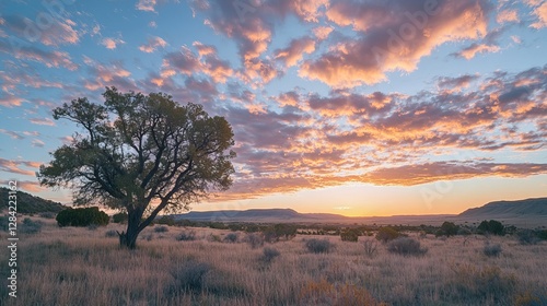 Majestic Sunset Landscape Serene Prairie Tree Silhouette Peaceful Golden Hour Dramatic Sky Vibrant Colors Breathtaking Nature Scenic View Tranquil