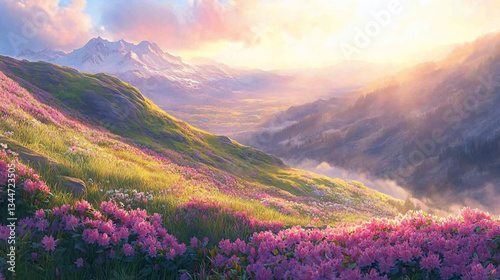 mountain, sunset, meadow, flower, alpine, spring, nature, landscape, scenic, beautiful, picturesque, vibrant, colourful, hill, vale, sunlight, sunrise, cloud, sky, green, pink, summer, blooming, wildflower, field, pastoral, serenity, calmness, peace, beauty, majestic, panorama, vista, idylli, romantic, breathtaking, wilderness, flora, vegetation, outdoors, travel, adventure, exploration