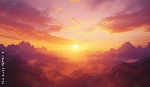 sunset, mountain, sunrise, cloud, sky, vale, mist, fog, landscape, nature, scenic, view, colours, vibrant, dramatic, gold, orange, pink, purple, horizon, aerial, mountain chain, peak, hill, elevation, light, warm, cool, beautiful, amazing, breathtaking, photo, digital artwork, fantasy, imagination, mountain summit, atmosphere, alps, rocky, panorama, colourful, glowing, peaceful, serene
