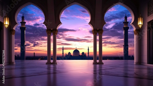 Majestic Sunset Over Mosque with Arched Windows and Stunning Sky