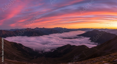 mountain, sunset, cloud, sunrise, landscape, nature, scenery, panoramic, view, sky, orange, pink, purple, red, vale, peak, hill, fog, mist, aerial, vista, majestic, dramatic, colourful, vibrant, beauty, serene, tranquil, calm, peaceful, wilderness, travel, adventure, exploration, photo, image, picture, alps, mountain chain, horizon, light, shadow, colours, texture, atmosphere, environment, earth
