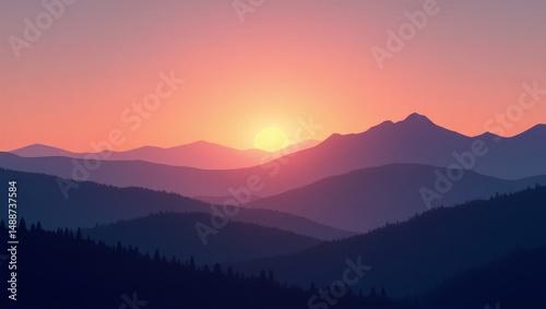 Majestic Sunset Over Mountain Range With Layers of Blue and Purple Hues Illuminating the Sky and Landscape During a Tranquil Evening in Nature