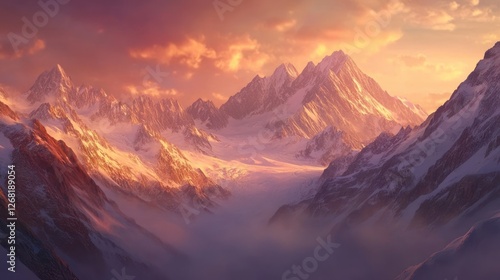 Majestic sunset over snowy mountain range, misty valley, dramatic sky; travel, tourism