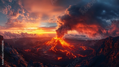 volcanic, island, sunset, panoramic, view, lava, glow, dramatic, sky, smoke, cloud, eruption, fiery, landscape, power, extreme, environment, geothermal, activity, molten, orange, hue, crater, ash, geologic, wonder, scenic, vista, natural, disaster, explosion, scenery, mountain, magma, flow