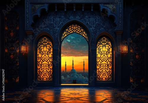 Majestic Sunset View Through Ornate Archway with Intricate Patterns and Silhouetted Minarets in the Background of an Exotic Landscape