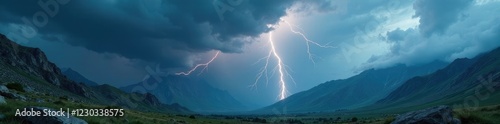 Majestic thunderheads gather over rugged mountain terrain, stormy, windy, moody
