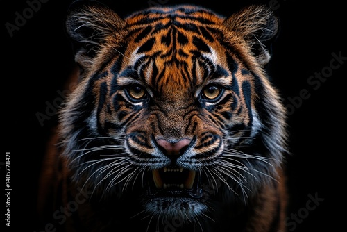Majestic tiger displays fierce expression against dark background in wildlife setting