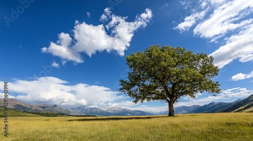 Majestic tree standing alone in a vibrant green field beneath a bright blue sky with fluffy clouds : Generative AI