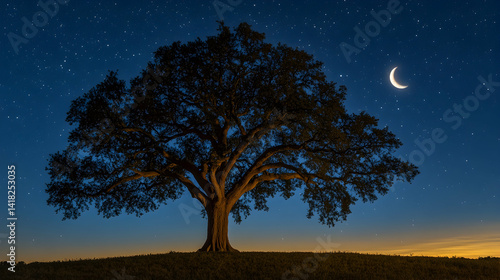Majestic tree stands silhouetted against the starry night sky with a crescent moon creating a serene and magical atmosp