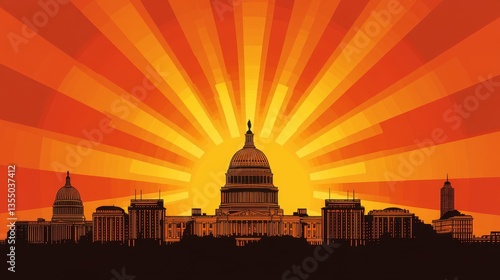 city landscape, building, sunset, capital, america, washington, dome, united, state, architecture, government, political, congress, landmark, silhouette, orange, sky, ray, sun, urban, national, historical building, structure, design, scene, illustration, graphic, vector, artwork, image, picture, photo, art, view, composition, visual, artistic, sunrise, daylight