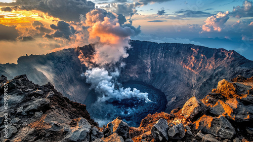 Majestic volcanic landscape at sunset with smoke rising from the crater, surrounded by rocky terrain