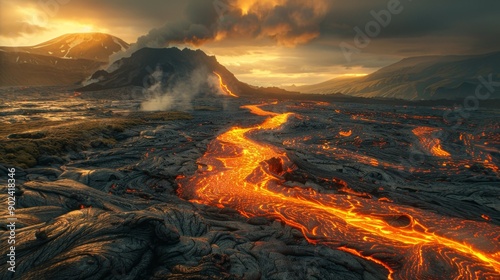 Majestic Volcano Awakening: Crater Lake Reflecting Sunrise Glow.