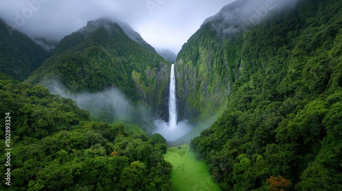 waterfall, mountain, green, lush, nature, landscape, scenery, travel, tour tourism, photo, aerial, view, rainforest, jungle, forest, cascade, water, mist, fog, cloud, vibrant, foliage, scenic, beauty, wilderness, paradise, calmness, serenity, environment, ecosystem, outdoors, adventure