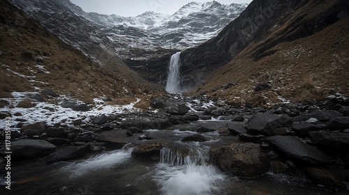 waterfall, mountain, snow, winter, nature, landscape, scenic, rock, stream, water, cold, river, ice, peak, vale, cascade, cliff, glacé, wilderness, travel, adventure, exploration, serenity, beauty, power, majestic, tranquil, picturesque, environment, geology, highland, hill, flow, current, stone, grey, brown, white, sky, cloud