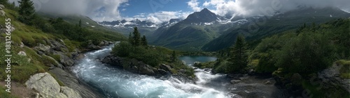 Majestic waterfall flowing through alpine landscape hdr panoramic view nature serenity