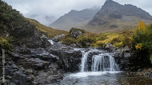 Majestic waterfall in the Fairy Pools, Glen Brittle, Isle of Skye, Scotland, cascading over rugged rocks with a famous cracked mountain in the background on a misty autumn day.