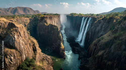 waterfall, canyon, river, nature, landscape, rock, cliff, gorge, natural wonder, powerful, majestic, long exposure, serene, scenic, outdoors, travel, destination, africa, wilderness, environment, geology, erosion, flow, mist, spray, dramatic, breathtaking, tranquil, water