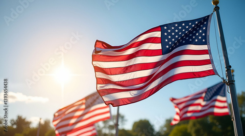 Majestic waving American flags are vividly portrayed in an outdoor setting, showcasing dynamic motion and crisp detail, evoking deep patriotism and national pride in this Photo Stock concept, with emp