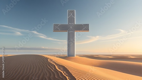 Majestic White Cross in a Serene Desert Landscape at Sunrise with Intricate Patterns