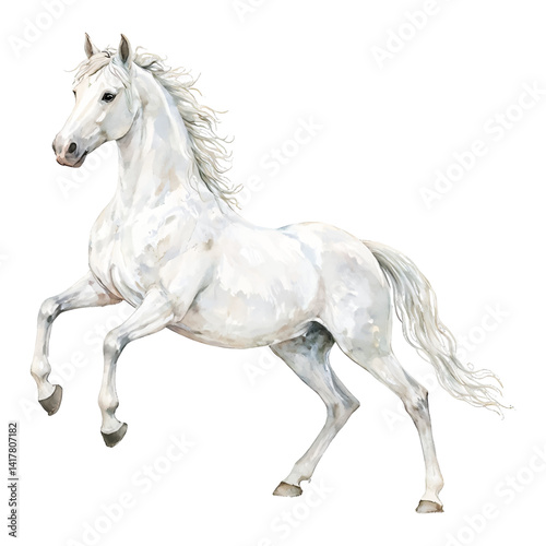 Majestic White Horse in Motion Isolated Hand Drawn Watercolor Painting Illustration