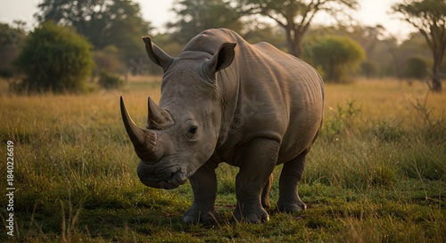 Majestic White Rhinoceros Standing Tall in African Savanna at Sunset.