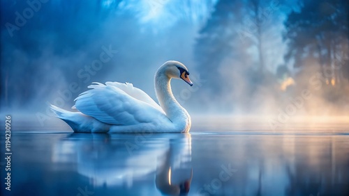 Majestic White Swan Profile on Misty Blue Lake - Low Light Photography