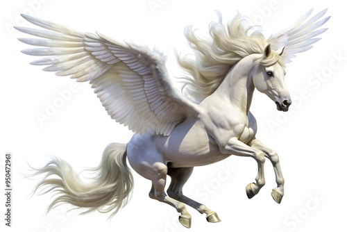 Majestic white winged horse, Pegasus, in flight, isolated on a white background