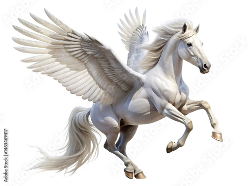 Majestic white winged horse, Pegasus, in flight, isolated on a white background PNG