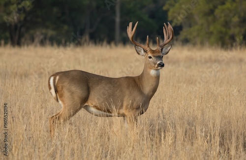 Majestic whitetail deer buck with large antlers stands in dry grass field in Texas farmland. Adult mammal pauses amidst tall, golden vegetation. Natural autumn environment shows off wild cervid,