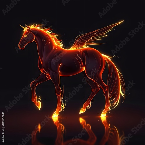 horse, fantasy, glowing, glow, perspective, majestic, fiery, creature, beauty, mythical, magic, light, design, surreal, high-coloured, colours, imagination, aethereal, striking, scene, powerful, visual, display, unique, vibrant, flight, motion, dynamic, inspiration, dream, spirit, art, concept, illustration, wing, radiant, expression, theme, attracted, innovation, mystery, aura, spectacle, character, grace