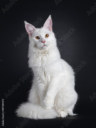 Majestic young adult solid white Maine Coon cat, sitting up facing front. Nice muzzle and big ears. Looking beside camera with golden eyes and one paw elegant lifted up. Isolated on a black background