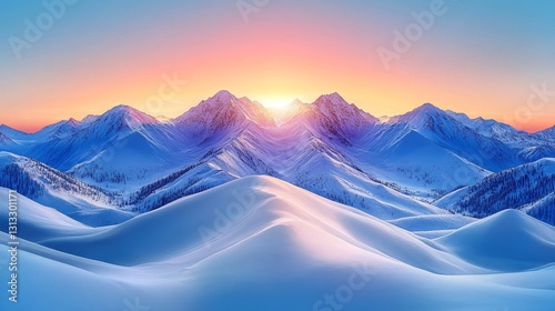 Majestic,Winter,Landscape,Glowing,Sunrise,Over,Snowy,Mountain,Peaks,Serene,Arctic,Environment,Dreamy,Scenery,Peaceful,Solitude