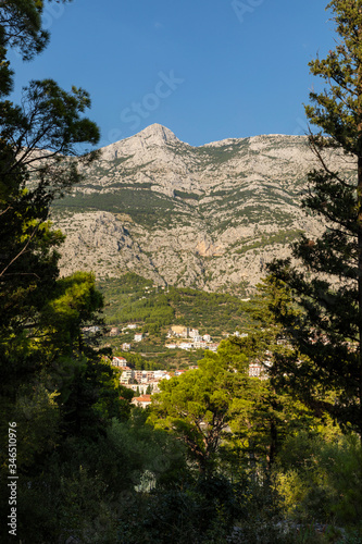 Makarska in Dalmatia, Croatia. View from the peninsula on a sunny day in summer and a blue sky. Rough nature, greenery, trees and rocks and the famous Biokovo mountain. Mediterranean coast, vertical