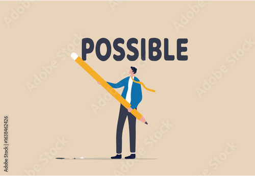Make it possible, erase im word from impossible and believe we can do it, challenge or hope to overcome difficulty and achieve success concept, businessman using eraser to delete im from impossible.