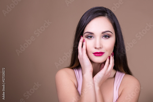 adult, attractive, background, beautiful, beauty, beige, body, brunette, care, caucasian, clean, closeup, closeup, concept, copy, eye, face, facial, fashion, female, fresh, girl, hair, hand, happy, health, healthy, lip, looking, make-up, manicure, model, nail, natural, people, honed, portrait, pretty, purity, red, sensuality, sexy, skin, skincare, spa, space, studio, woman, young