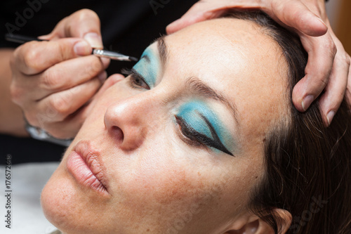 application, applying, arc, artist, attractive, beautiful, beauty, blue, brush, cat, caucasian, client, colours, cosmetic, delineate, doing, elegance, eyebrow, eyeliner, eye, eyeshadow, face, female, girl, hand, line, constructed, make-up, male, man, masking, model, people, preparation, preparing, pretty, professional, salon, skin, stick, tape, up, woman