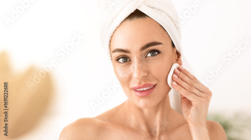Make up remover. Woman with sponge and micellar water. Skin care and beauty. Young cute brunette female in towel wipes face, with cotton pad, on white bathroom background, in morning, free space