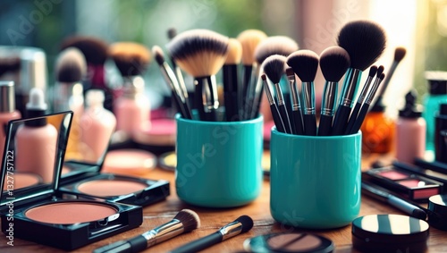 Makeup artist tools prepared for use with natural light in the background. Display of brushes in holders.