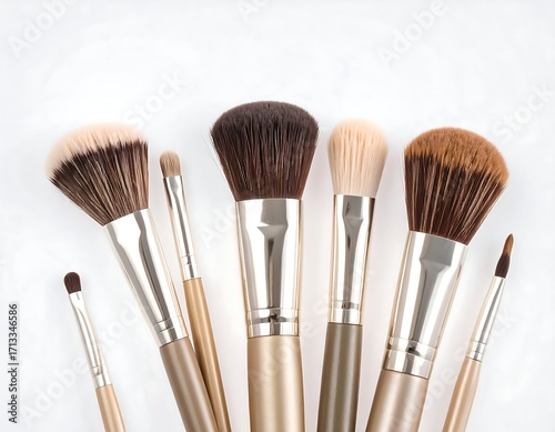 Makeup brushes, various shapes and sizes, arranged on white background