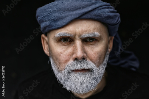 make-up man with a beard / concept oriental portrait in traditional dress, gray-haired white beard in an Arab man