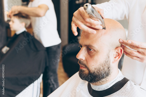 making hairstyle for man in a Barber shop, Latin American man gives a haircut to a bald bearded man in the barbershop salon