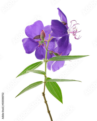 Malabar melastome flowers with leaves, Tropical purple flower isolated on white background