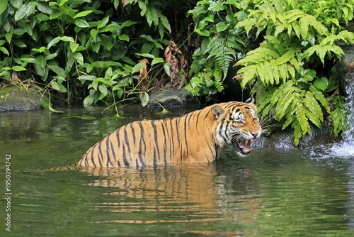 Malaysia tiger (Panthera tigris jacksoni), adult, in water, alert, Malaysia, Southeast Asia