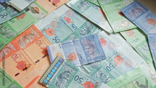 Malaysian ringgit banknotes in various denominations scattered, showcasing the colorful currency from malaysia.