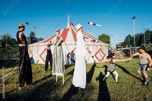 male, female, artist, performing, meadow, people, music, playing, sport, adult, group, woman, man, outdoors, athleticism, circus, performer, tent, ethnic, sunlight, shadow, juggling, club, stilts, costume, motion, holding, hand, blue, sky, accordion, keyboard, instrument, musical, acrobatic, acrobat, artist, tradition, old-fashioned, young, caucasian, hispanic, skill, clear, performance, entertainment, gymnastics