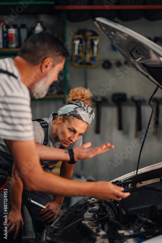Male and female auto mechanics examining at discussing problem with car
